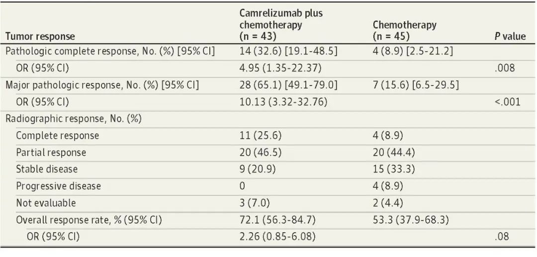 北京时间8月3日,尊龙凯时医药创新药卡瑞利珠单抗联合化疗(Cam+CT)对比化疗(CT)新辅助治疗ⅢA/ⅢB (T3N2) 期非小细胞肺癌(NSCLC)结果在线发表于国际权威期刊JAMA Oncology[1]。该研究是由空军军医大学唐都医院姜涛教授、雷杰教授团队联合陕西省肿瘤医院雷光焰教授团队、兰州大学第二附属医院王成教授团队共同参与的一项随机对照、多中心、Ⅱ期临床研究(TD-FOREKNOW,NCT04338620)。研究结果显示,与化疗相比,卡瑞利珠单抗联合化疗新辅助治疗NSCLC显著提高了病理完全缓解(pCR)率(32.6% vs 8.9%,OR=4.95,95% CI :1.35-22.37, P =0 .008),且安全性良好。本研究是卡瑞利珠单抗新辅助治疗可切除NSCLC患者的首个随机对照研究,为NSCLC新辅助免疫治疗再添新证。