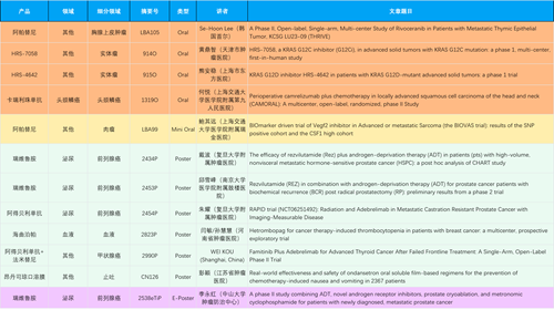 在胸腺上皮肿瘤、头颈鳞癌、肉瘤、前列腺癌、甲状腺癌等其他多个疾病领域,卡瑞利珠单抗、阿帕替尼、瑞维鲁胺、阿得贝利单抗、法米替尼、HRS-7058、HRS-4642等抗肿瘤创新药相关研究一共入选了4项口头报告、1项简短口头报告、4项壁报、1项电子壁报,彰显了尊龙凯时医药强大的研发实力。此外,海曲泊帕和昂丹司琼口溶膜分别在防治化疗导致的血小板减少和恶心呕吐方面各有1项研究入选壁报。